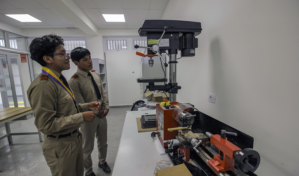 Con el objetivo de contribuir al fortalecimiento de la formación técnica y el desarrollo de competencias laborales, la nueva escuela cuenta con tres talleres de Educación para el Trabajo totalmente equipados con máquinas de subliminación y para bordar, impresoras 3D, cortadoras láser, escáners, entre otros equipos, además de mobiliario nuevo y cómodo para el nivel secundaria.